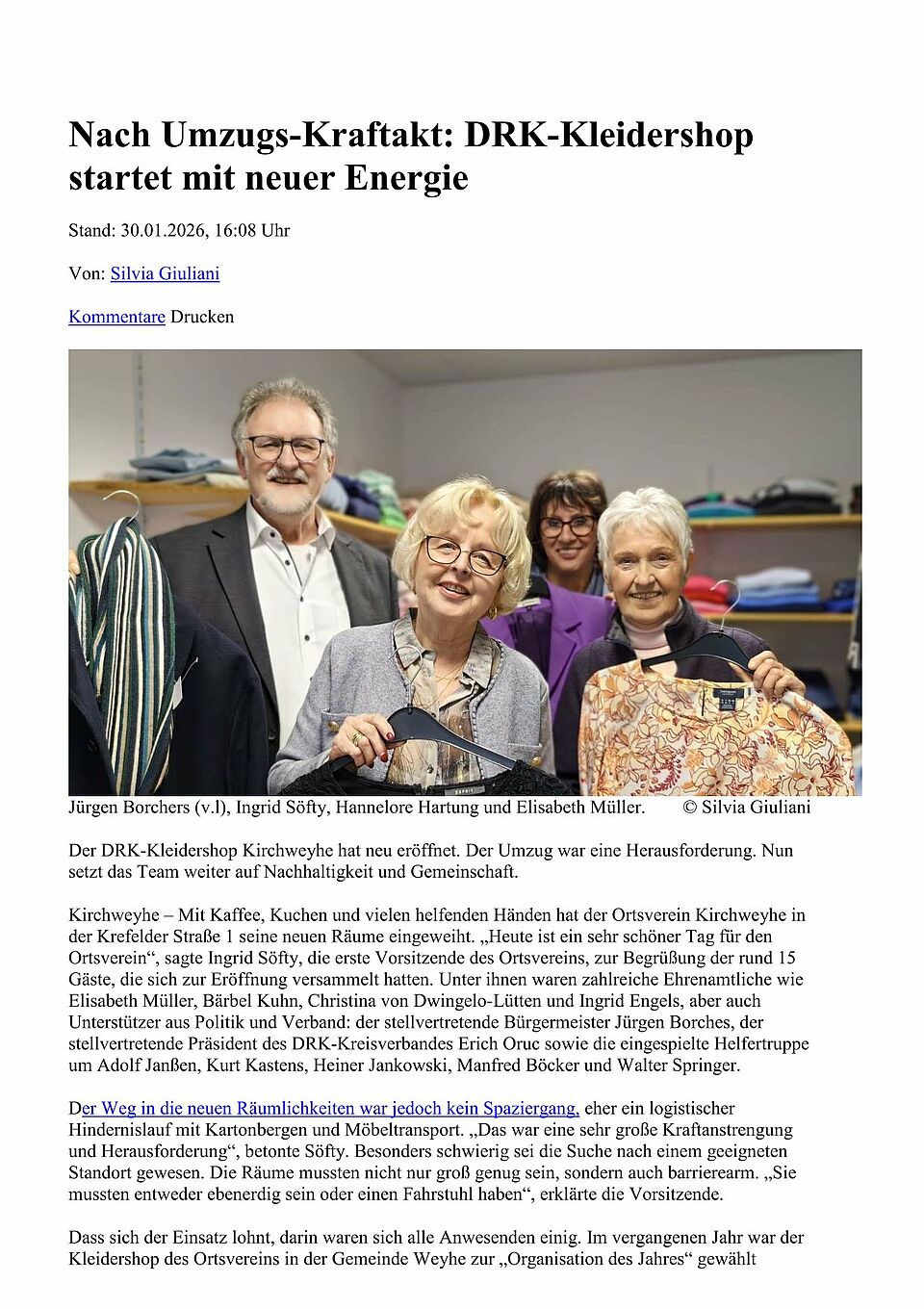Schauen Sie doch einfach einmal in unseren Kleidershop des Deutschen Roten Kreuzes (DRK) herein! Sie ist eine Fundgrube für kostenbewusste Menschen und Schnäppchenjäger, aber auch in Sachen Mode. Vielleicht wartet ja schon ein ganz spezielles und Einzelstück darauf. In unserem Shop wählen Sie als Kundinnen und Kunde selber aus, was Sie kaufen. Und das in hoher Qualität und zu akzeptablen Preisen. Die Angebote können dabei unterschiedlich sein, so dass sich ein Besuch immer lohnt: